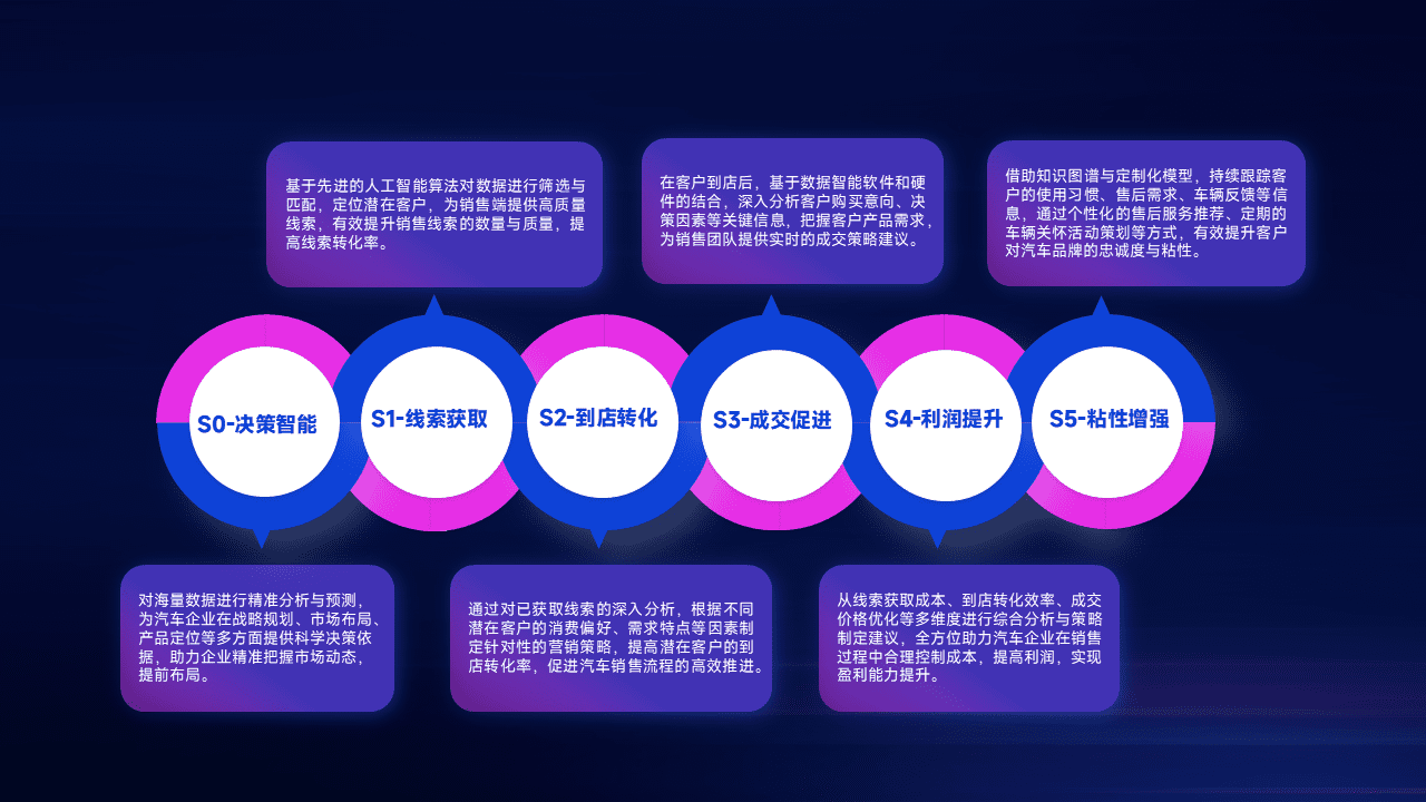 通过拓宽潜在客户来源、、优化线索分配并提高到店转化率,,以增强销售效率。。。同时,,利用线索数据不断优化分析模型,,,有效提升转化率,,扩大营销影响力。。。